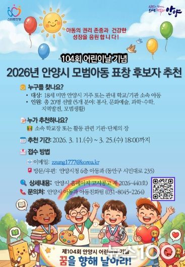 뉴스100 김동초 기자 | 안양시는 어린이날을 맞아 다양한 분야에서 모범이 되는 아동을 발굴하기 위해 ‘2026년 모범아동 유공 표창’ 후보자를 11일부터 25일까지 추천받는다고 11일 밝혔다.