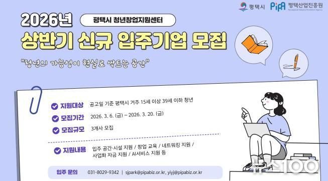 뉴스100 김동초 기자 | 평택시와 평택산업진흥원은 오는 20일까지 녪년 평택시 청년창업지원센터 신규 입주기업’을 공개 모집한다.