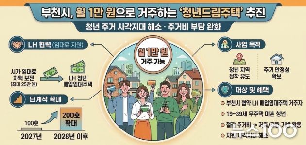 뉴스100 김동초 기자 | 부천시는 청년층의 주거 불안을 해소하고 지역 정착 여건을 강화하기 위해 월 1만 원의 임대료로 거주할 수 있는 ‘부천 청년드림주택’ 사업을 추진하고 있다. 관내 한국주택공사(LH) 청년 매입임대주택에 거주하는 청년이 월 1만 원을 부담하면 시가 월 최대 25만 원까지의 임대료 차액 전액을 LH에 직접 보전 지원하는 사업이다.