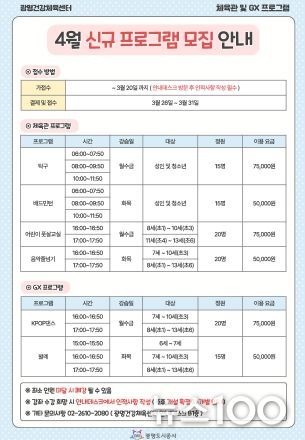 뉴스100 김동초 기자 | 광명도시공사는 광명건강체육센터에서 시민들의 건강 증진과 생활체육 활성화를 위해 체육관 및 GX실 4월 신규 프로그램 회원을 모집한다고 밝혔다.