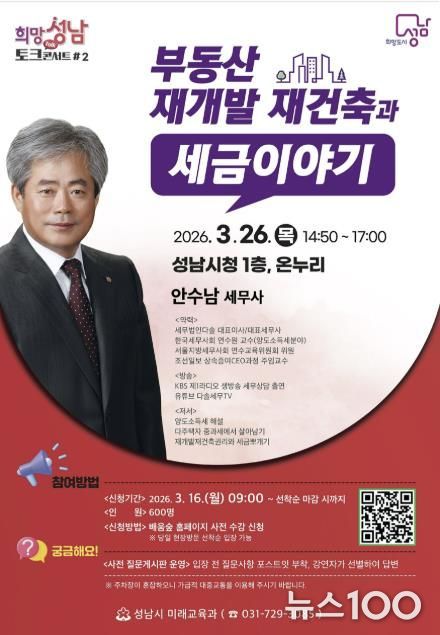 뉴스100 김동초 기자 | 성남시는 오는 3월 26일 오후 2시 50분 시청 1층 온누리에서 ‘부동산·재개발 재건축과 세금 이야기’를 주제로 한 명사 초빙 강연을 연다.
