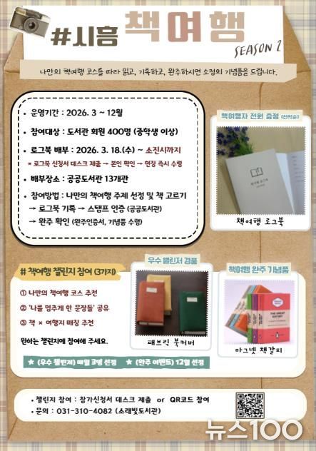뉴스100 김동초 기자 | 시흥시도서관은 시민의 독서 실천을 지원하고 일상 속 독서문화를 확산하기 위해 3월 18일부터 ‘2026 시흥 책여행(시즌2)’ 로그북을 배부하고, ‘책여행 로그북 챌린지’를 함께 운영한다.