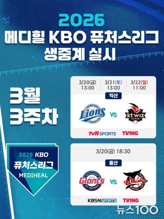 뉴스100 김동초 기자 | KBO는 3월 20일(금) 개막하는 2026 메디힐 KBO 퓨처스리그 경기를 TV 채널 tvN SPORTS, KBSN SPORTS와 OTT 플랫폼 TVING을 통해 생중계 한다.
