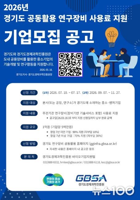 뉴스100 김동초 기자 | 경기도와 경기도경제과학진흥원이 도내 중소·벤처기업의 연구개발(R&D) 경쟁력 강화를 위해 ‘2026년 경기도 공동활용 연구장비 사용료 지원 사업’을 추진한다.