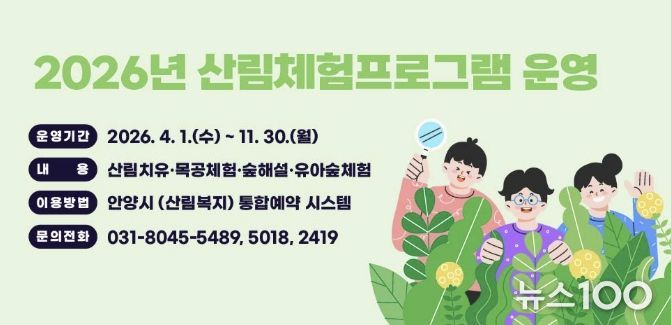 뉴스100 김동초 기자 | 안양시는 4월부터 서울대 안양수목원을 비롯한 관내 수목원에서 ‘산림체험 프로그램’ 운영을 시작하며, 현재 통합예약시스템을 통해 사전 예약을 접수 중이라고 23일 밝혔다.