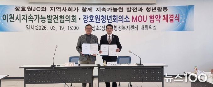 뉴스100 김동초 기자 | 이천시지속가능발전협의회는 지난 3월 19일, 장호원읍행정복지센터 대회의실에서 장호원청년회의소와 지역사회 청년활동의 리더십 과제 협업을 위한 업무협약(MOU)을 체결했다고 밝혔다.