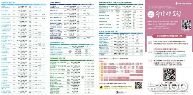뉴스100 김동초 기자 | 수원특례시는 3월 25일 오전 10시부터 수원시 평생학습관 2026년 2분기 프로그램 수강생을 모집한다.