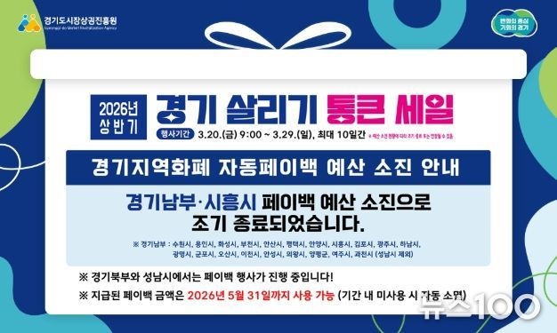 뉴스100 김동초 기자 | 경기도시장상권진흥원은 도내 소상공인 매출 증대와 지역경제 활성화를 위해 추진하고 있는 ‘2026년 상반기 경기 살리기 통큰 세일’(이하 통큰 세일)이 도민들의 높은 참여 속에 일부 지역에서 조기 소진됐다고 25일 밝혔다.