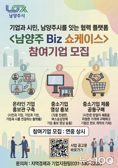 뉴스100 김동초 기자 | 남양주시는 지역 중소기업의 판로 개척과 인지도 향상을 위한 종합 홍보사업 ‘남양주 Biz 쇼케이스’ 참여기업을 상시 모집한다고 26일 밝혔다.
