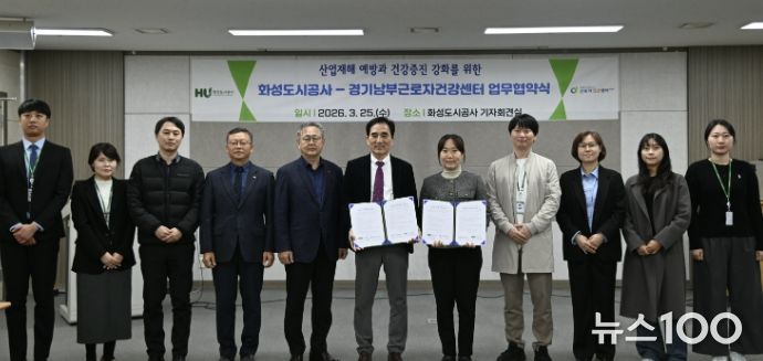 뉴스100 김동초 기자 | 화성도시공사는 25일 경기남부근로자건강센터(경기남부직업트라우마센터)와 근로자 건강증진과 직업 트라우마 예방, 심리 지원체계 강화를 위한 업무협약을 체결했다고 밝혔다.