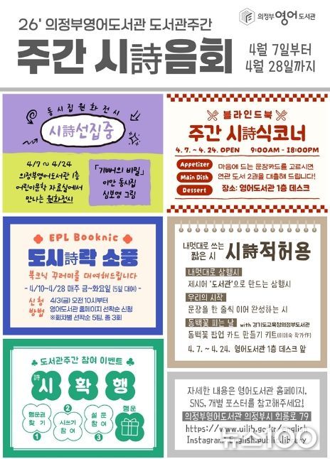 이번 행사에서는 ‘주간 시詩음회: 시가 있는 도서관’을 주제로 북크닉, 블라인드북, 시 쓰기 체험 활동, 원화 전시 등 다양한 형태의 이용자 참여형 프로그램을 운영할 예정이다.