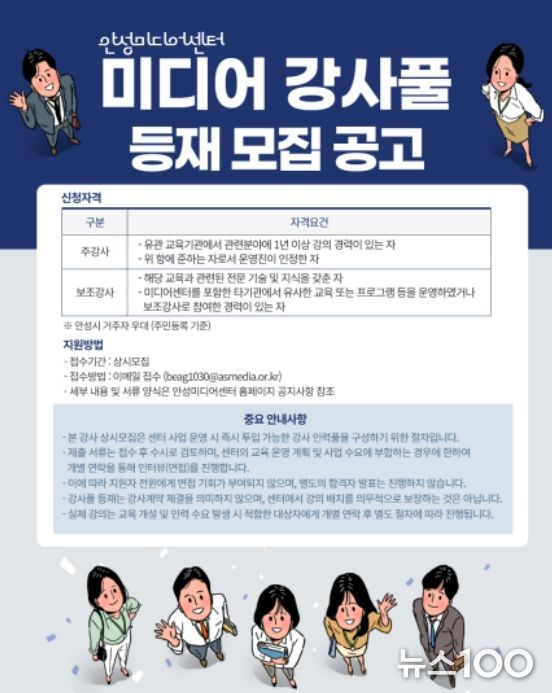 뉴스100 김동초 기자 | 안성시는 4월 1일부터 보다 체계적이고 전문적인 미디어 교육 운영을 위해 ‘미디어 강사풀’ 등재 강사를 상시 모집한다.