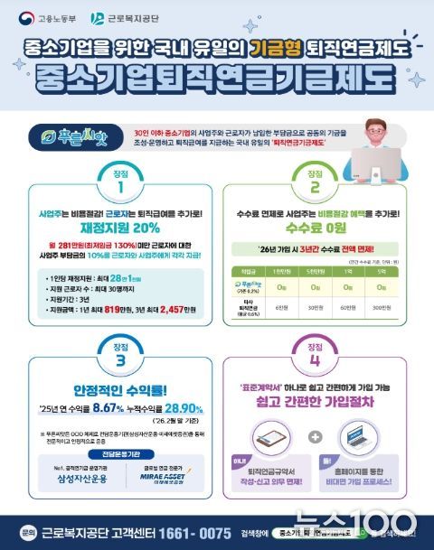 이와 함께 최근'근로자퇴직급여보장법'개정에 따라 오는 7월 1일부터는 가입 대상이 기존 30인 이하 사업장에서 50인 미만 사업장으로 확대되고 2027년부터는 100인 미만 사업장까지 단계적으로 확대될 예정이다.