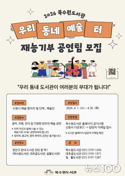 뉴스100 김동초 기자 | 북수원·대추골·일월도서관은 시민 참여 문화공연 ‘우리동네 예술 터’에 참여할 재능기부 공연팀을 4월 30일까지 모집한다.