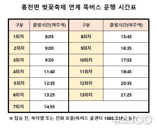 이충우 여주시장은 “흥천 남한강 벚꽃축제는 매년 수많은 인파가 몰리는 여주의 대표 축제인 만큼, 방문객들이 교통 불편 없이 축제를 즐길 수 있도록 특별 운행을 마련했다.”며, “특히 여주역에서 바로 연결되는 똑버스를 편리하게 이용해 즐거운 봄나들이 즐기시길 바란다”고 전했다.