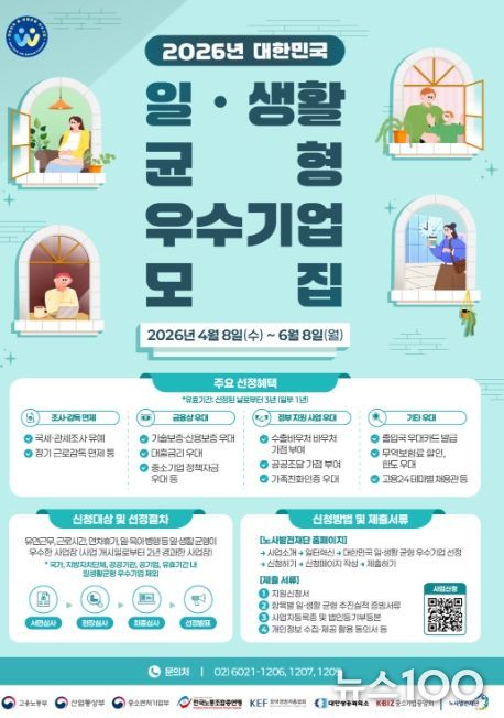 뉴스100 김동초 기자 | 노동자의 일·생활 균형을 적극적으로 실천하는 기업이 인재 확보에 성과를 거두고 있다. 고용노동부는 이러한 우수사례 확산을 위해 산업통상부, 중소벤처기업부, 한국노동조합총연맹, 한국경영자총협회, 대한상공회의소, 중소기업중앙회와 함께 「대한민국 일・생활 균형 우수기업」을 4월 8일부터 모집한다고 밝혔다.