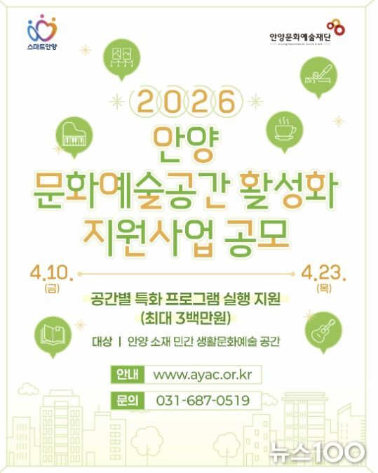 뉴스100 김동초 기자 | 안양문화예술재단은 지역 내 민간 생활문화예술 공간의 자립 기반을 강화하고 문화시민을 육성하기 위한 '2026 문화예술공간 활성화 지원사업' 참여 공간을 공개 모집한다고 8일 밝혔다.