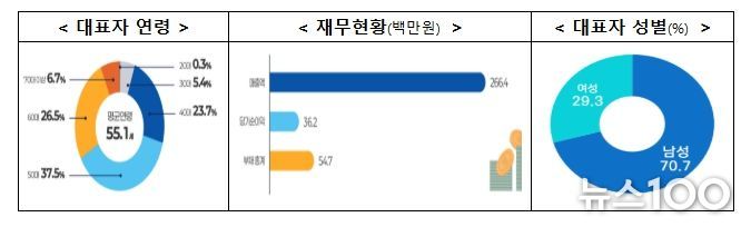 대표자 연령은 평균 55.1세, 성별은 남성 70.7%, 여성 29.3%로 조사됐으며, 기업당 평균 매출액은 266.4백만원, 당기순이익은 36.2백만원으로 나타났다.