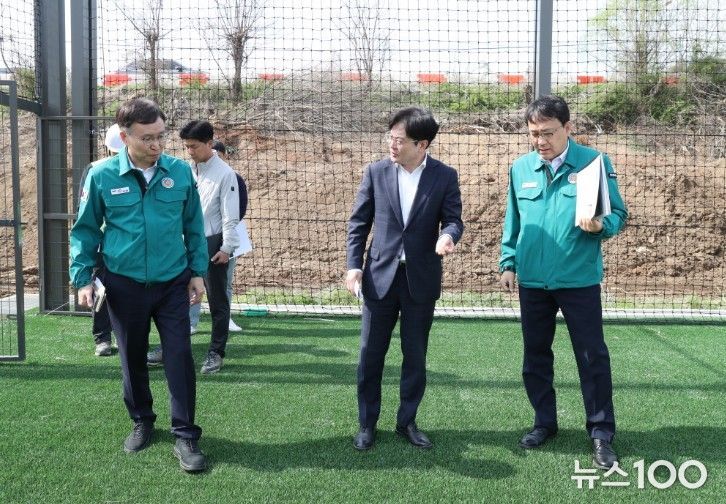 김병수 시장을 비롯해 교육문화국장, 도시주택국장 등이 함께 한 이날 현장 행정에서는 축구장 조성 현황을 확인하고 진입로 설치공사 현장을 직접 점검했다.