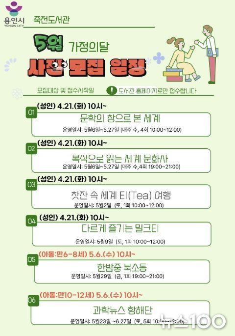 뉴스100 김동초 기자 | 용인특례시 죽전도서관은 오는 5월 가정의 달을 맞아 ‘2026년 5월 독서문화행사’를 개최한다.