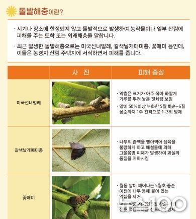 대표적인 돌발 해충으로는 갈색날개매미충, 꽃매미, 미국선녀벌레 등이 있으며, 피해를 최소화하고 확산 방지를 위해 복숭아, 배, 사과, 포도 등 면적 792ha, 1,429호의 농가에 적용 약제를 공급한다.