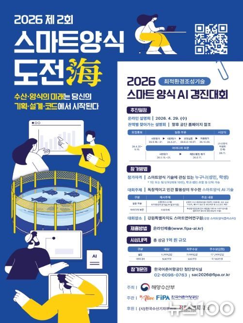 뉴스100 김동초 기자 | 해양수산부와 한국어촌어항공단(이사장 홍종욱)은 4월 20일부터 5월 15일까지 ‘제2회 스마트양식 도전해(海) 경진대회’의 공모를 실시한다고 밝혔다.
