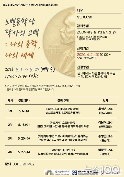 뉴스100 김동초 기자 | 수원시 광교홍재도서관이 한국외국어대학교와 협력해 진행하는 2026년 세계문화기행 시리즈 1편 ‘노벨문학상 작가의 고백 : 나의 문학, 나의 세계’ 강좌를 수강할 시민을 모집한다.
