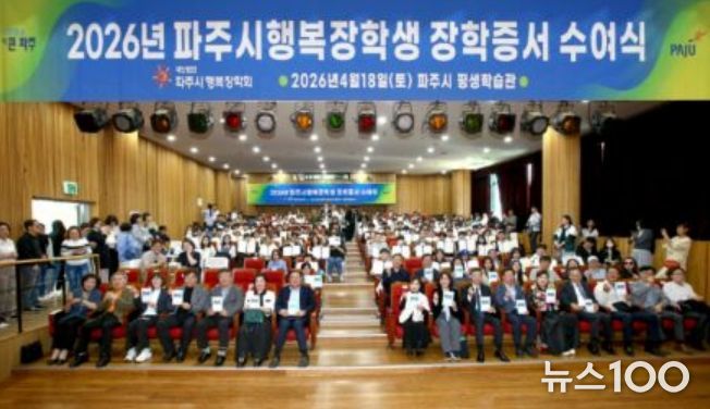 뉴스100 김동초 기자 | 파주시는 (재)파주시행복장학회가 지난 18일 파주시 평생학습관 대공연장에서 학부모와 장학생 등 200여 명이 참석한 가운데 2026년 장학증서 수여식을 개최했다고 밝혔다.