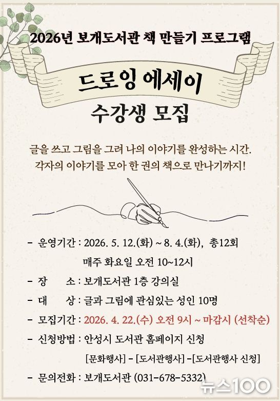 뉴스100 김동초 기자 | 안성시 보개도서관(책문화센터)이 시민들의 창작 활동을 지원하고 일상 속 예술 경험을 확대하기 위해 오는 5월부터 ‘드로잉 에세이’와 ‘포토 에세이’ 책 만들기 프로그램을 새롭게 운영한다고 밝혔다.