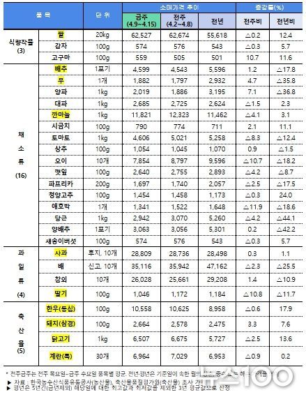 점검 결과, 농산물은 대다수 품목이 전년 대비 낮은 수준이다. 특히, 양파, 양배추, 당근 등 노지채소류는 가격이 큰 폭으로 하락함에 따라 시장격리, 정부 비축물량 출하정지와 함께 소비촉진을 추진하고 있다.
