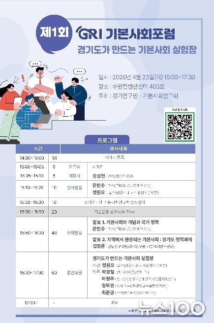 뉴스100 김동초 기자 | 경기연구원은 오는 23일 오후 3시 수원컨벤션센터 403호에서 ‘경기도가 만드는 기본사회 실험장’을 주제로 ‘제1회 GRI 기본사회포럼’을 개최한다.