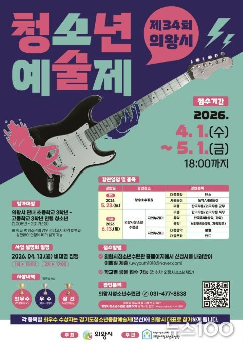 뉴스100 김동초 기자 | 의왕시청소년재단 산하 의왕시청소년수련관은 지역 청소년의 예술적 재능과 끼 발산의 장인 ‘제34회 의왕시청소년예술제’의 참가자를 5월 1일까지 모집한다고 밝혔다.