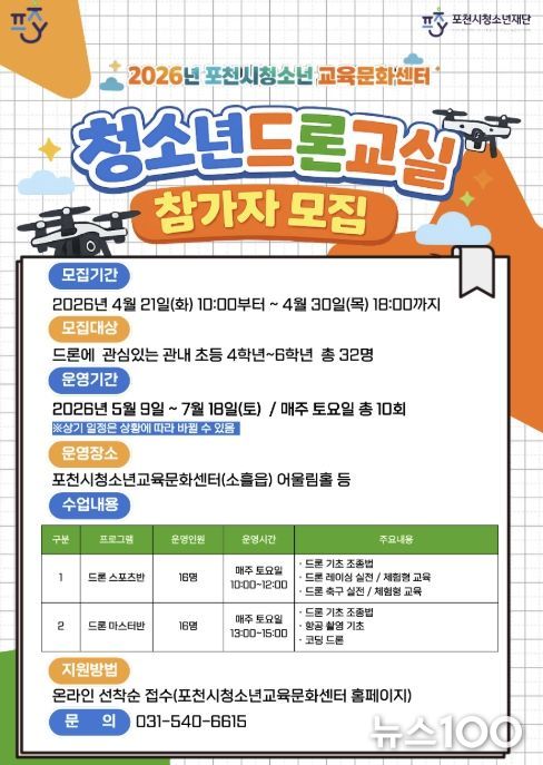 뉴스100 김동초 기자 | (재)포천시청소년재단 포천시청소년교육문화센터는 오는 4월 21일부터 30일까지 관내 초등학교 4학년부터 6학년을 대상으로 청소년드론교실 1기 참가자를 선착순으로 모집한다고 밝혔다.