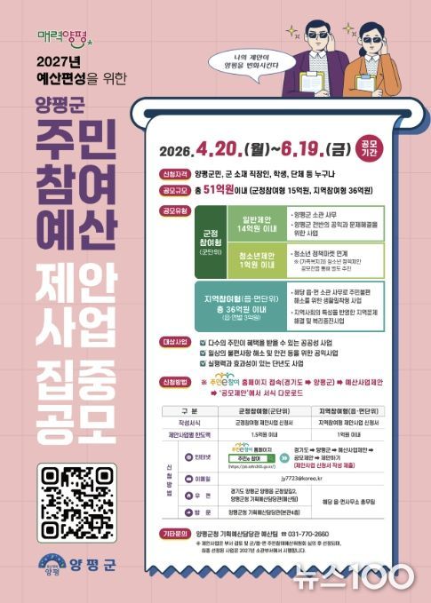 뉴스100 김동초 기자 | 양평군은 오는 6월 19일까지 2027년 예산에 반영할 ‘주민참여예산 제안사업’을 집중 공모한다고 밝혔다.
