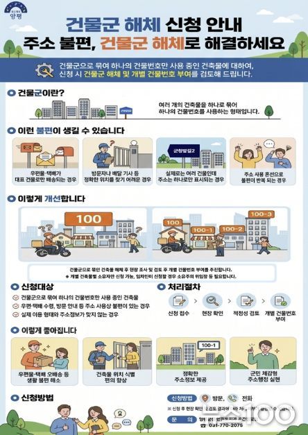 건물군은 여러 개의 건축물을 하나로 묶어 동일한 건물번호를 부여·관리하는 방식이다. 그러나 건물군 내 여러 거주자와 이용자가 있음에도 하나의 건물번호만 사용함에 따라 우편물과 택배, 소포 등이 대표 건물로 집중되는 사례가 발생하고 있다. 이로 인해 등기 반송, 택배 오배송, 방문객 안내 지연 등 생활 속 불편이 지속돼 왔다. 또한 실제로는 서로 다른 건축물임에도 주소상 동일한 건물번호를 사용함으로써 위치 식별이 어렵고, 응급상황이나 안전사고 발생 시 신속한 대응에도 어려움이 있었다.