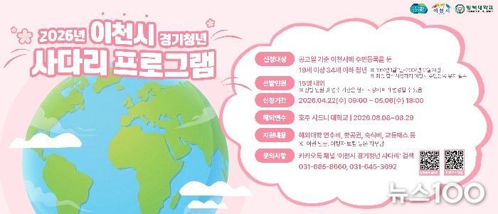 뉴스100 김동초 기자 | 이천시는 지역 청년들에게 글로벌 경험을 제공하기 위해 '이천시 경기청년 사다리프로그램(운영기관: 평택대학교 산학협력단)' 2기 참여자를 모집한다고 밝혔다.