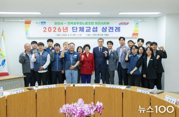 뉴스100 김동초 기자 | 이천시와 전국공무원노동조합 이천시지부는 4월 21일 시청 5층 다올실에서 노사 양측 대표 교섭위원인 김경희 이천시장과 이재인 공무원노조 지부장 등 노사 양측 교섭위원 20여명이 참석한 가운데‘2026년도 공무원노조 단체교섭 상견례’를 가졌다.