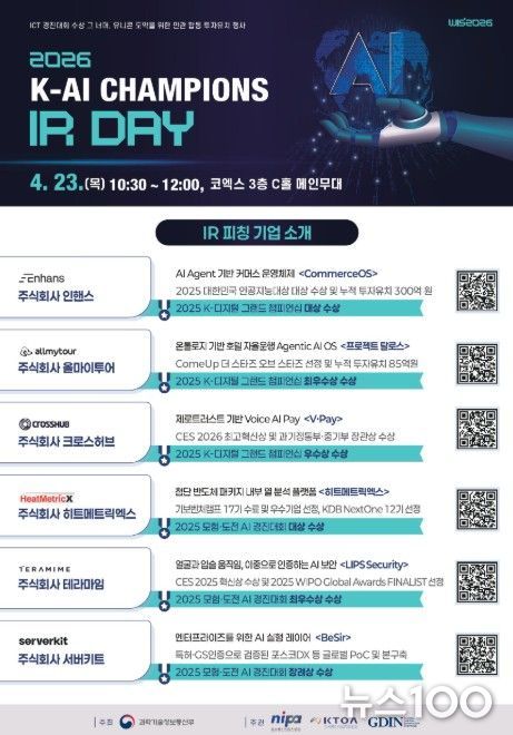 뉴스100 김동초 기자 | 과학기술정보통신부는 정보통신산업진흥원, 한국통신사업자연합회와 함께 4월 23일 서울 코엑스에서 ‘2026 K-AI Champions IR Day’을 개최했다고 밝혔다.