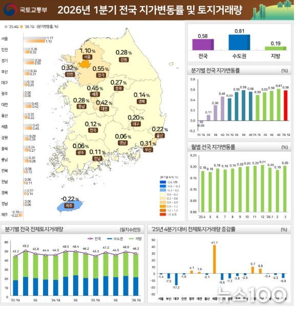 뉴스100 김동초 기자 | 국토교통부와 한국부동산원(원장 이헌욱)은 '26년 1분기 지가변동률 및 토지거래량을 발표했다.