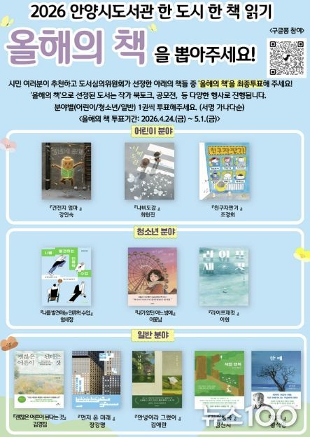 뉴스100 김동초 기자 | 안양시는 2026년 한 도시 한 책 읽기 ‘올해의 책’ 선정을 위한 시민 선호도 조사를 오는 5월 1일까지 온·오프라인으로 진행한다고 24일 밝혔다.