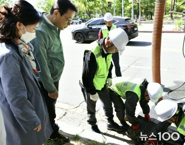 뉴스100 김동초 기자 | 수원시 영통구는 24일 매탄동 1341 일대를 방문해 우기 대비 빗물받이 준설 현장을 점검했다.