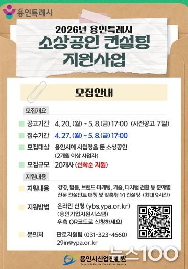 뉴스100 김동초 기자 | 용인특례시와 용인시산업진흥원은 ‘2026년 용인시 소상공인 창업 및 경영 컨설팅 지원사업’에 참여할 소상공인을 모집한다고 26일 밝혔다.