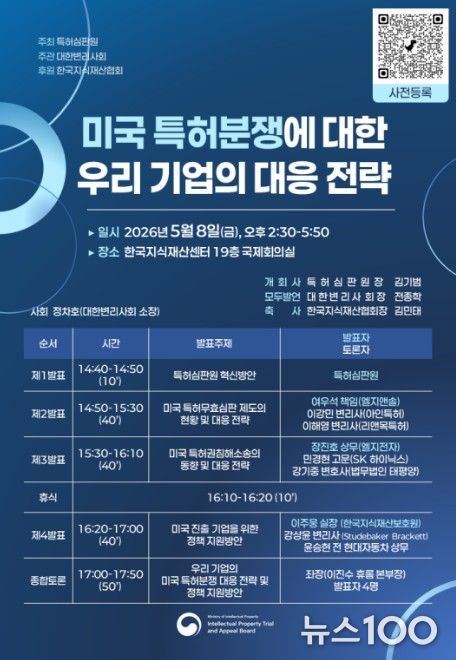 뉴스100 김동초 기자 | 지식재산처 특허심판원은 5월 8일 14시 30분 한국지식재산센터(서울 강남구)에서 우리 기업의 미국 특허분쟁 대응 역량 강화를 위해 '미국 특허분쟁에 대한 우리 기업의 대응전략' 발표회를 개최한다고 밝혔다.