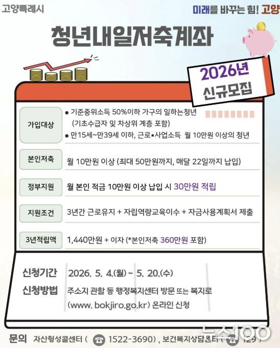 뉴스100 김동초 기자 | 고양특례시는 5월 4일부터 시작하는 청년내일저축계좌 신규 가입자 모집을 앞두고, 가입 독려에 나섰다.