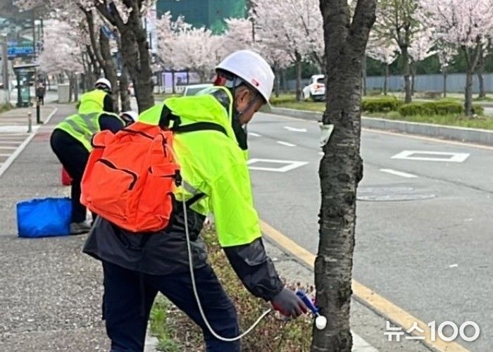 뉴스100 김동초 기자 | 화성특례시 만세구는 최근 증가하는 식엽성 해충 피해에 대응하기 위해 주요 벚나무길을 중심으로 수간주사 방제를 실시했다고 27일 밝혔다.