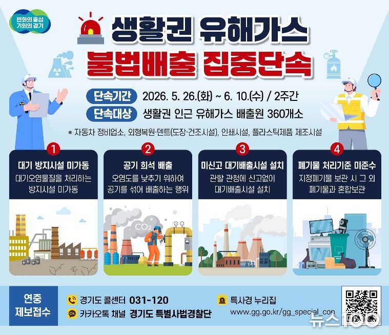 뉴스100 김동초 기자 | 경기도 특별사법경찰단이 5월 26일부터 6월 10일까지 2주간 주거지·학교·병원 등 생활권 인근 지역의 유해가스 배출 사업장을 대상으로 불법행위를 집중단속 한다.