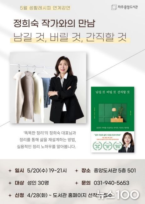 뉴스100 김동초 기자 | 파주시 중앙도서관은 오는 5월 20일 19시, 정리 전문가 정희숙 작가를 초청한 '남길 것, 버릴 것, 간직할 것' 강연을 개최한다.