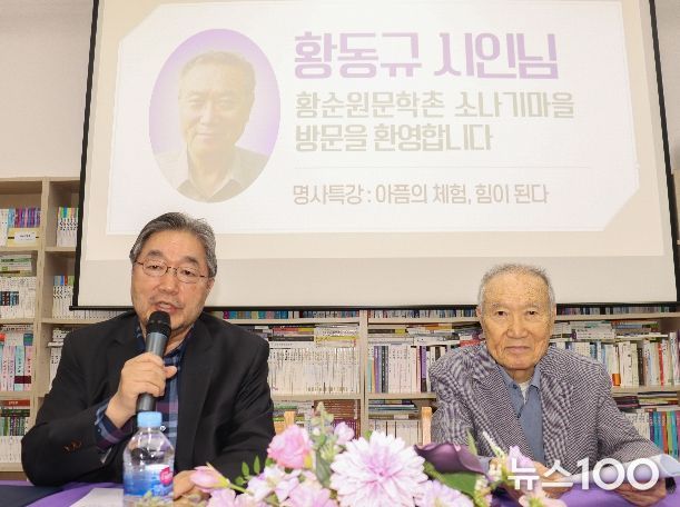 뉴스100 김동초 기자 | 황순원 작가의 장남인 황동규(1938~) 시인이 지난 23일 서종면에 위치한 황순원문학촌 소나기마을(촌장 김종회)에서 열린 ‘2026 소나기마을 문학교실’에서 ‘아픔의 체험, 힘이 된다’를 주제로 특별 강연을 진행했다.