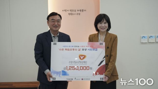 뉴스100 김동초 기자 | 수원시청소년청년재단은 28일, 수원시자원봉사센터와 수원 독립운동의 길 추진위원회가 주관하는 ‘수원 독립운동의 길’ 조성 시민 모금에 재단 임직원이 자율적으로 모금한 125만원을 기부했다고 밝혔다.