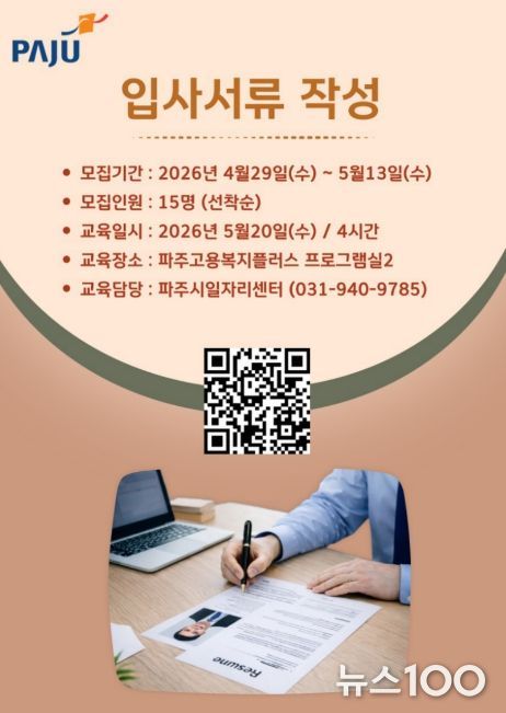 뉴스100 김동초 기자 | 파주시는 중장년 구직자의 원활한 노동시장 재진입을 돕기 위해 ‘입사서류 작성 실습 교육’참여자 15명을 모집한다.